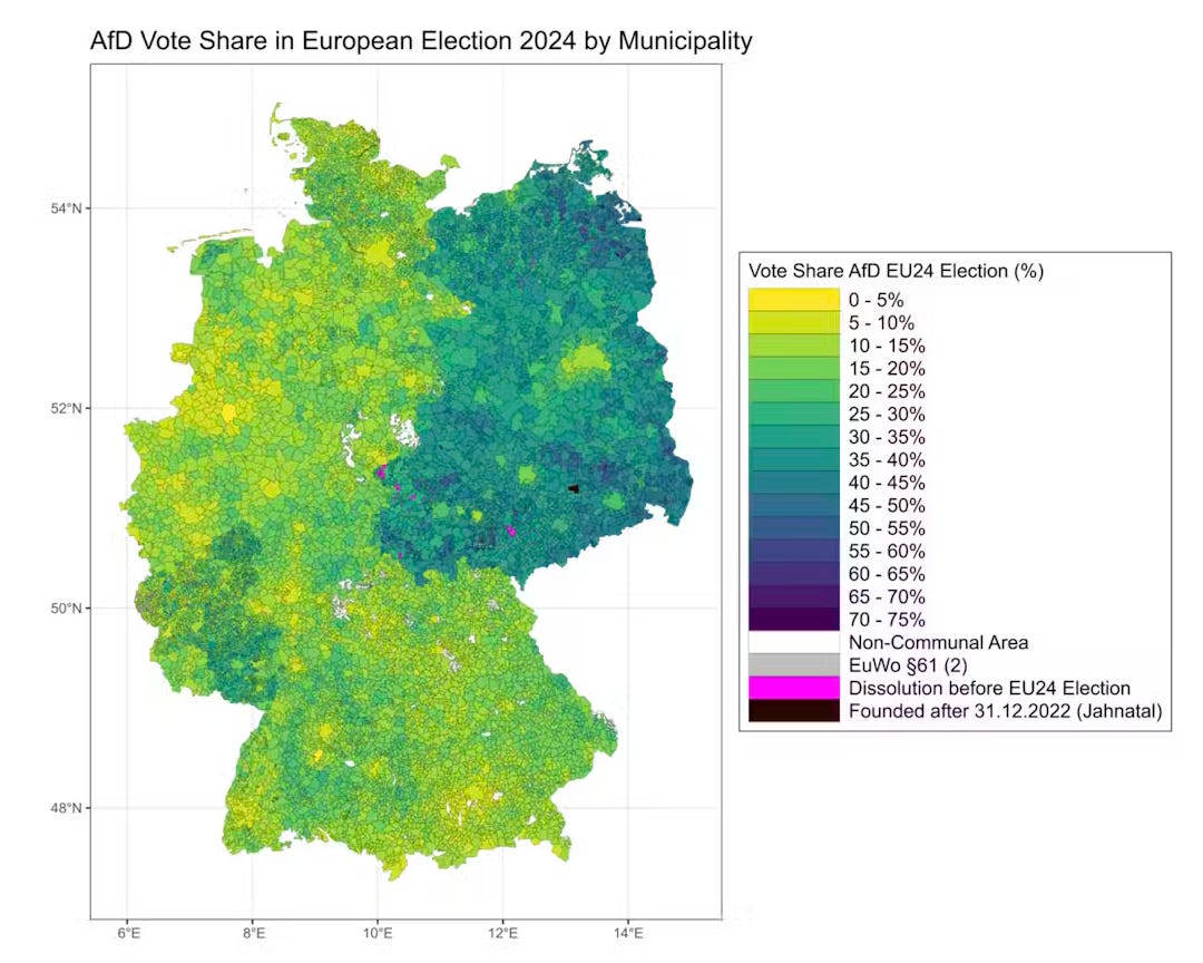 There’s also evidence that this isn’t a distinctly American issue. For example, take a look at Germany. Its clear over time the states that were formerly a part of East Germany have lagged behind the rest of the country. It is also no coincidence that this is where the AfD, Germany’s Neo-Nazi political party, has their political base of support.